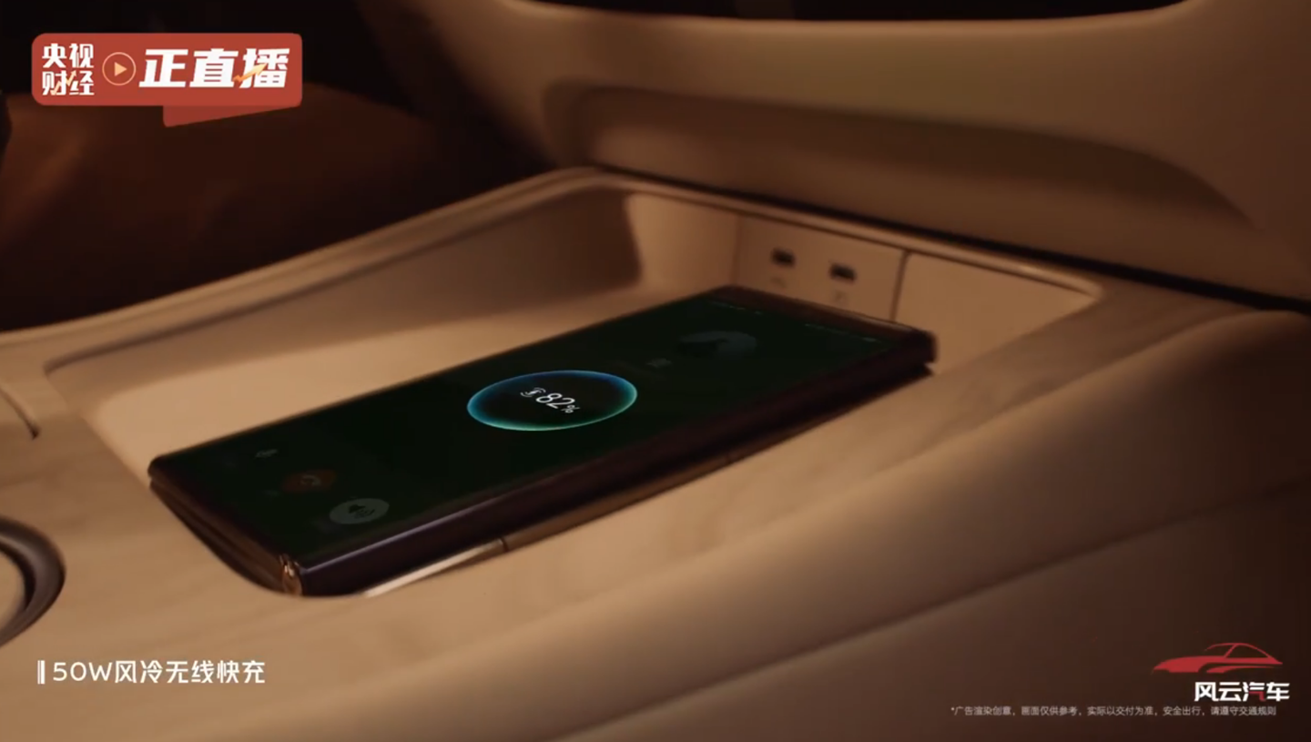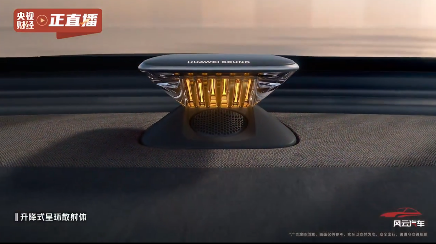 该车配有 50W 风冷无线快充、AI 助手、氛围灯,保留关键的实体键,还有 HUAWEI SOUND 音响。
