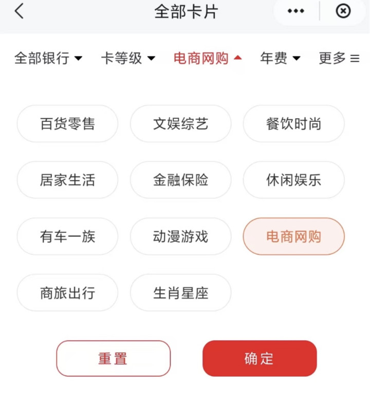 虽然上面分类看上去很多,但是部分内容是有交叉重叠的,你可以同时在主题,卡等级、年费、特色服务、卡分类中同时勾选,这样能够更精准的选择到自己的信用卡。